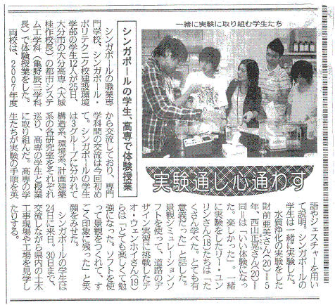 共同実験の様子は、環境工学研究室で行った水質浄化実験が大分合同新聞社の取材を受け、2009年9月27日(日)の大分合同新聞朝刊に写真付きで掲載されました。