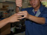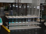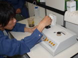 平成22年6月24日(木)に都市システム工学科4年生による実験実習において活性炭吸着試験を行いました。この実験では染色剤であるメチレンブルーを対象としてその水溶液の活性炭吸着処理特性を明らかにすることを目的としました。学生はメチレンブルー水溶液に活性炭を添加してその濃度が経時的に低下する様子を興味深く観察していました。その後、実験データをもとにメチレンブルーに対する活性炭の吸着等温線を求め、吸着処理の原理の理解を深めました。